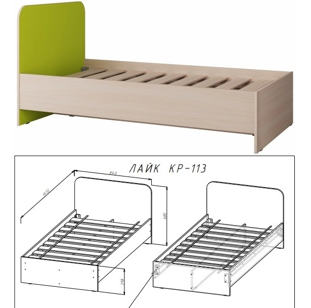 - Головной щиток кровати, облицованный кромочным материалом толщиной 2мм, выполнен с точки зрения безопасности в процессе эксплуатации детьми за счёт своих скруглённых углов.
