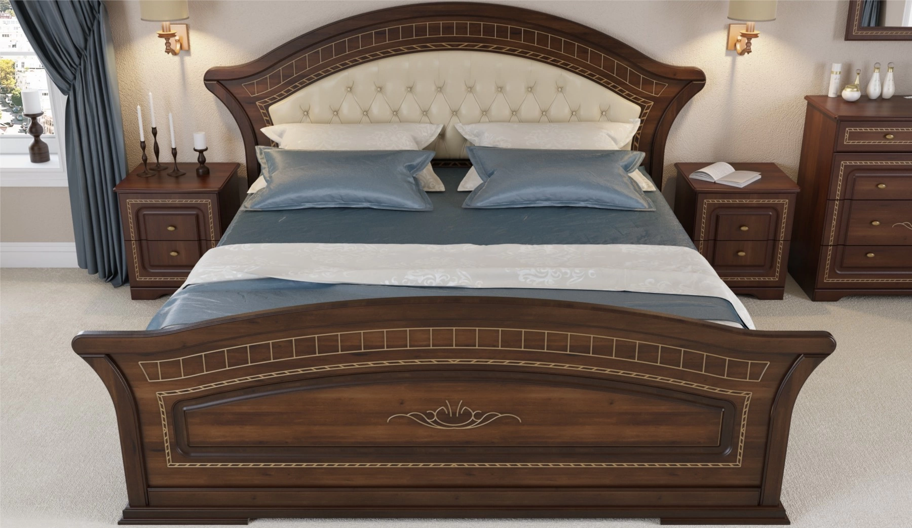 Фасады спальни "Диана", покрытые лаками, красками и патиной ручной работы - это настоящий шедевр, проверенный временем в Европе и дошедший до наших дней. Технология производства фасадов является разработкой итальянских мастеров 19-го века. Фасады точно передают внешний вид и текстуру натурального дерева. Основой фасада служит экологически чистый МДФ, покрытый патиной ручной работы для получения знаменитого в традиционной классике эффекта старения!