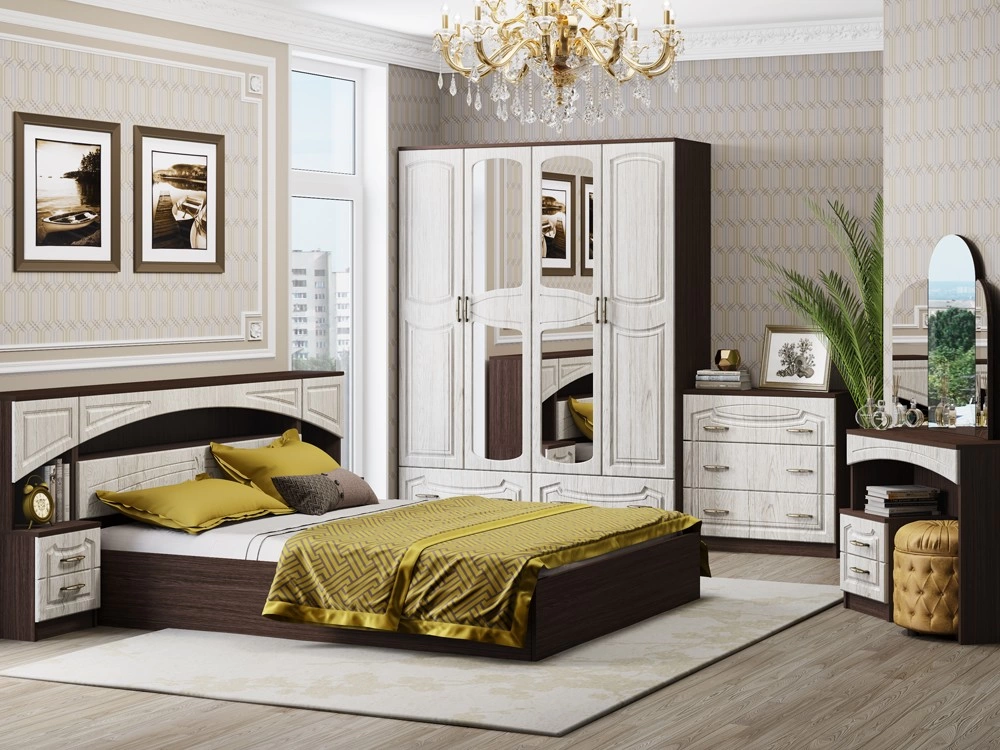 Спальня Кармен МДФ - спальный гарнитур, который позволит меблировать даже небольшое по габаритам помещение. Стиль, в котором выполнена мебель, подойдет как для любителей классики, так и для почитателей современного дизайна. Двуспальная кровать с высоким изголовьем, вместительный шкаф (внутри полки и штанга) с зеркалом, изящный туалетный столик и другие предметы гарнитура позволят оформить уютное и комфортное помещение для отдыха. Использованные в изготовлении модулей ламинированная плита и фасады из МДФ по качеству полностью отвечают требованиям современного производства. спальный гарнитур, который позволит меблировать даже небольшое по габаритам помещение. Стиль, в котором выполнена мебель, подойдет как для любителей классики, так и для почитателей современного дизайна. Двуспальная кровать с высоким изголовьем, вместительный шкаф с зеркалом, изящный туалетный столик и другие предметы гарнитура позволят оформить уютное и комфортное помещение для отдыха. Использованные в изготовлении модулей ламинированная плита и фасады из МДФ по качеству полностью отвечают требованиям современного производства.