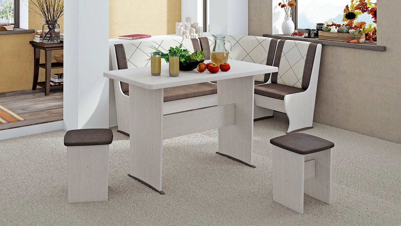 - Обеденная зона "Челси Т2" состоит из удобной угловой скамьи, практичного стола и компактных табуретов.